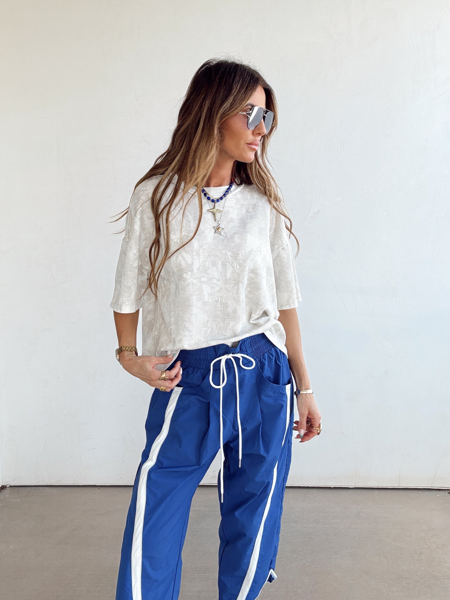 The dropped shoulders and wide sleeves add to its easygoing vibe, making it a go-to for any casual occasion. It's the kind of tee that looks just as good with some high-waisted denim as it does with a flowy skirt.